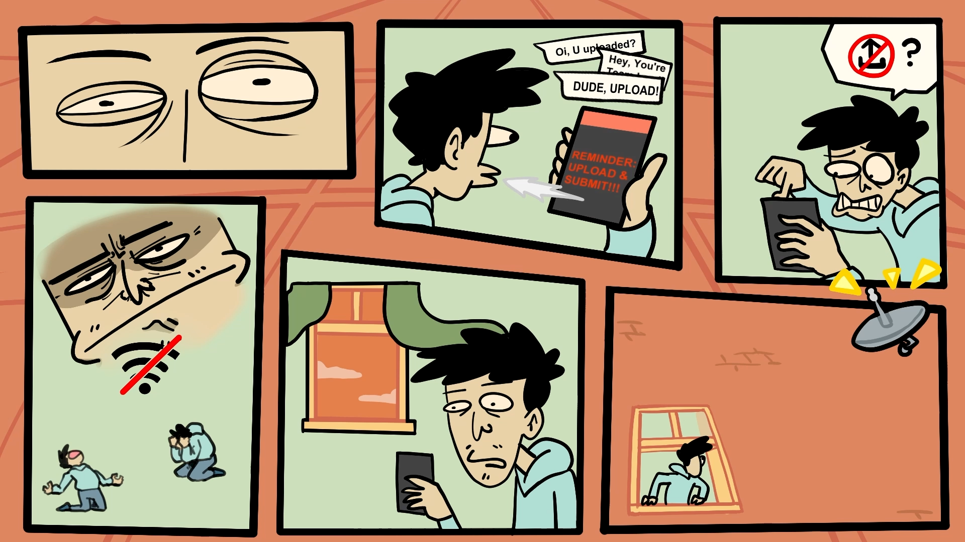Having gone through digital learning during the pandemic era, our team is familiar with people like our protagonist. (Some in our team may have BEEN that person). Putting off submitting their assignments so close to the deadline, for one reason or another. We thought it'd be funny to exaggerate the lengths someone like this would go to just so they can upload their assignment in time.